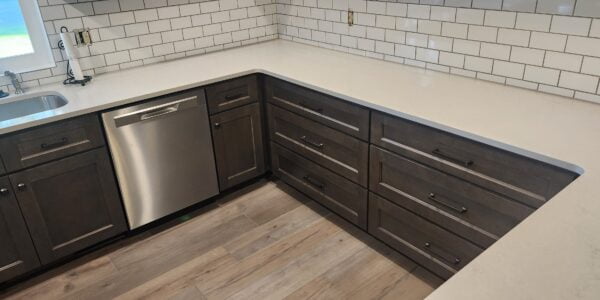 The small kitchen remodel presented several significant challenges, primarily due to the property’s older construction. The existing structure was out of plumb and square, which complicated the installation of the pre-fabricated cabinets and countertops. Adjustments had to be made to ensure everything fit correctly and functioned properly within the uneven framework.