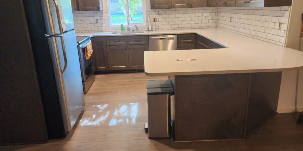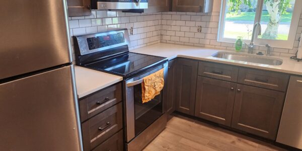 The small kitchen remodel focused on maximizing both style and functionality with thoughtful updates. The project featured the installation of pre-fabricated cabinets, chosen for their efficiency and streamlined design. These cabinets were complemented by new quartz countertops, which provided a sleek and durable surface perfect for both cooking and entertaining.