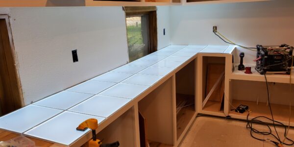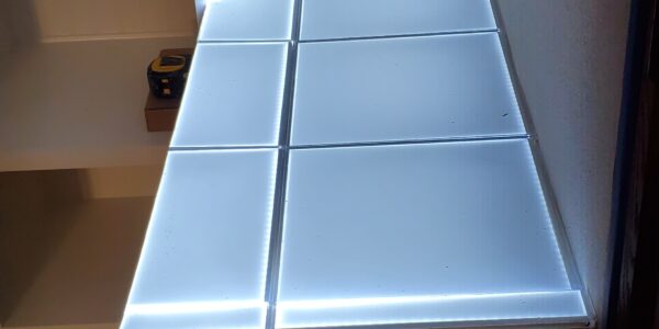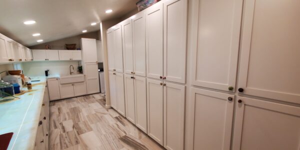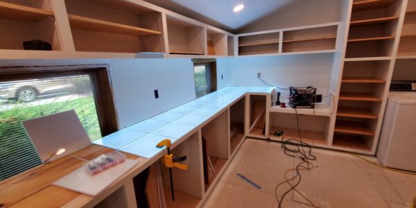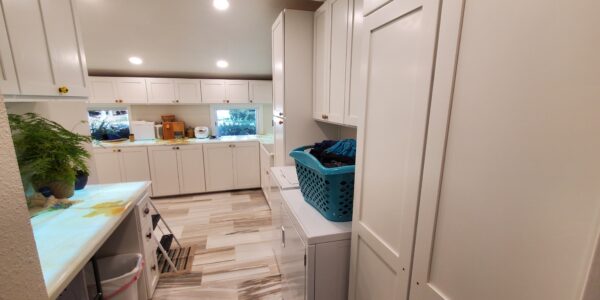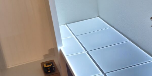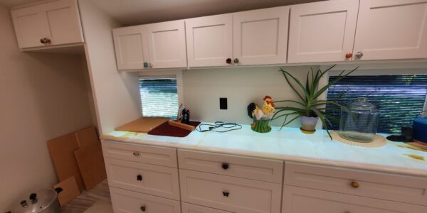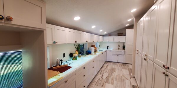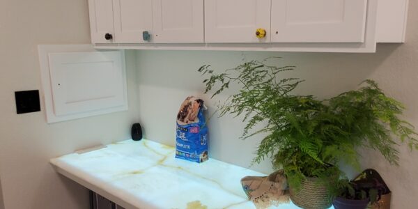 Another significant challenge was the installation of the low voltage wiring and LED panels beneath the semi-translucent Onyx countertops. The wiring had to be meticulously planned and executed to not only power the LED panels effectively but also allow for future maintenance. This meant that each LED panel needed to be removable from inside the cabinets even after the Onyx countertops were installed. Achieving this level of accessibility while maintaining the structural integrity and aesthetic appeal of the cabinets required careful engineering and attention to detail. Despite these complexities, the project was completed successfully, resulting in a beautifully lit and functional prep kitchen and study station that perfectly balanced elegance with practicality.