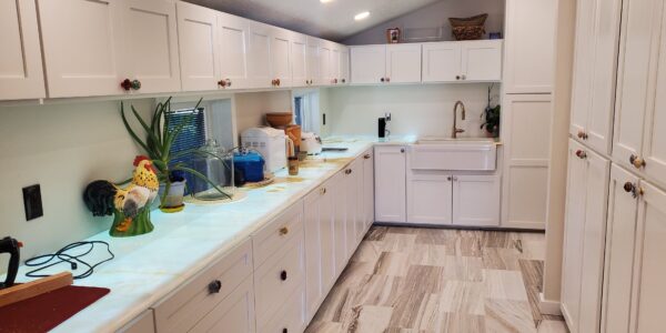 This prep kitchen remodel was designed with a blend of elegance and innovation, featuring a combination of white Shaker cabinets, luxurious Italian marble floor tiles, and cutting-edge lighting solutions. The centerpiece of the kitchen was the semi-translucent Onyx countertops, which were illuminated from beneath by LED panels. This lighting not only highlighted the natural beauty of the Onyx but also added a modern, ambient glow to the space, creating a unique and visually striking effect.