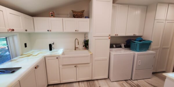 The design incorporated white paint-grade Shaker cabinets and a deep blue island, which not only added visual appeal but also cleverly increased storage and workspace. The installation of the over-the-fridge wine rack cabinet was a strategic choice, turning an often-overlooked area into valuable storage space. Careful planning was required to ensure that the quartz countertops and subway tile backsplash complemented the design while maintaining the kitchen’s practicality. Despite the spatial constraints, the project successfully created a kitchen that was both stylish and highly functional, making the most of every available inch.