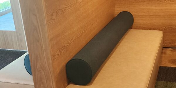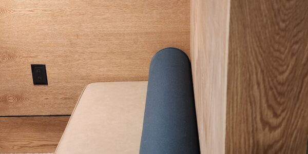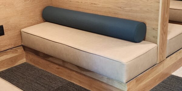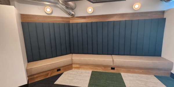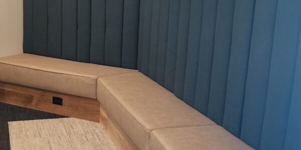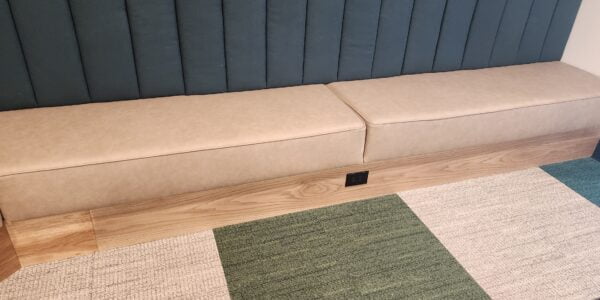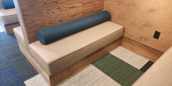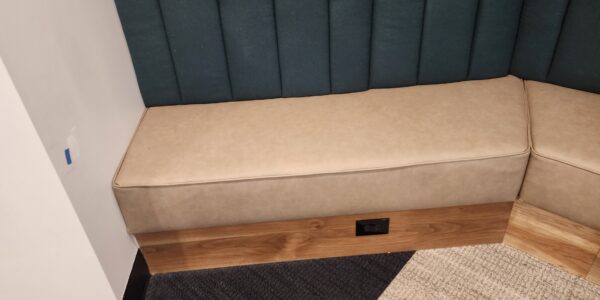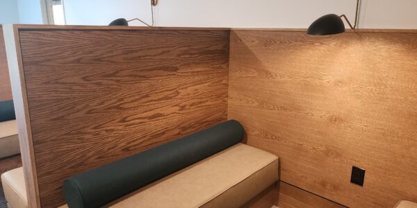 The remodel of the high-end apartment business center in downtown Boise presented significant logistical challenges. Located on the second floor, far from elevators and vehicle access, transporting the custom-stained white oak booths and partitions into the space was no small feat. Due to their size, the booths had to be assembled on-site, requiring careful planning and precise craftsmanship to ensure a perfect fit.