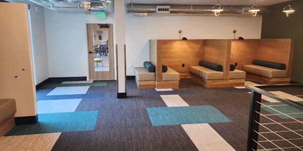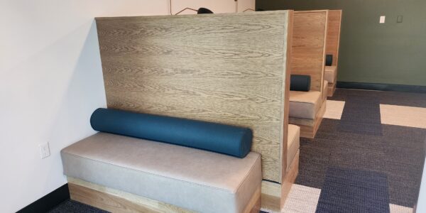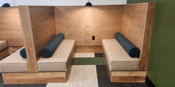 Nestled along the Boise River in downtown Boise, a high-end apartment business center was recently remodeled to reflect the upscale nature of its surroundings. Central to the design were custom-stained white oak booths and partitions, meticulously crafted and installed to provide both functionality and elegance. The rich tones of the stained wood added warmth and sophistication to the space, creating an inviting atmosphere for residents and professionals alike.