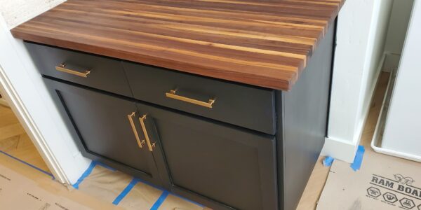 To complement the new cabinetry, walnut butcher block countertops were installed, offering a warm, natural touch and adding a touch of sophistication to the space. The combination of the dark cabinetry with the warm tones of the walnut countertops created a striking and cohesive look, transforming the laundry room into a stylish and functional area.