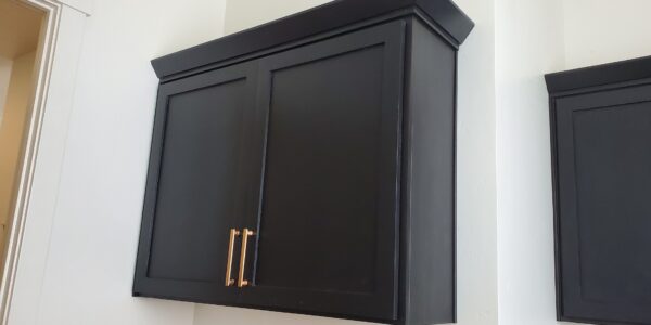 The small laundry room remodel focused on achieving a sleek and modern look through key updates to the cabinetry and countertops. The existing cabinets were resurfaced with a rich, stained black color, providing a bold and contemporary contrast that enhanced the room’s overall aesthetic.